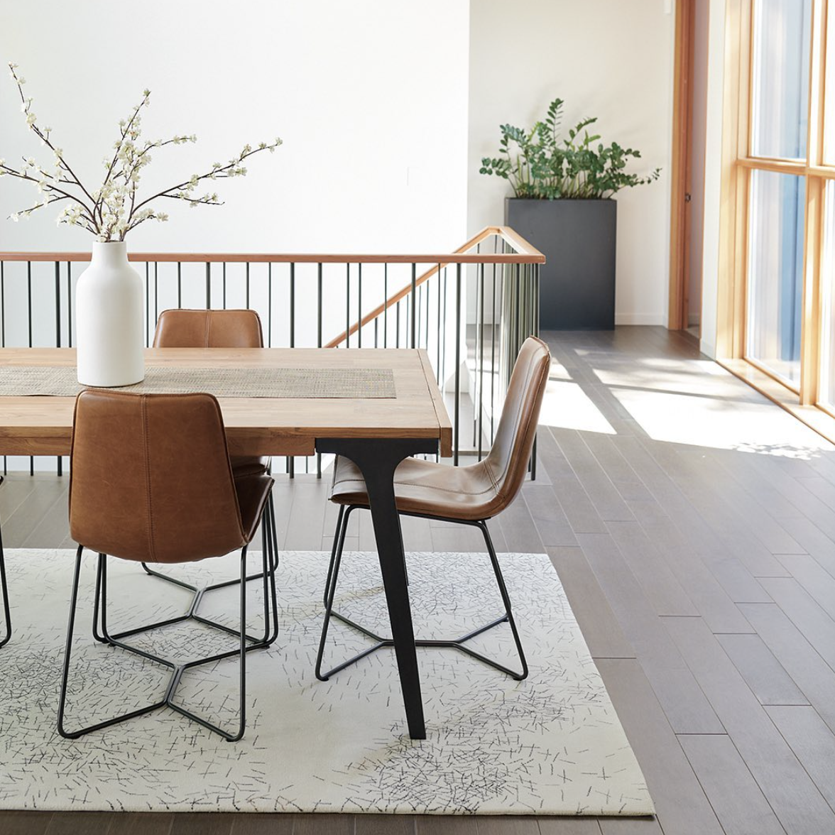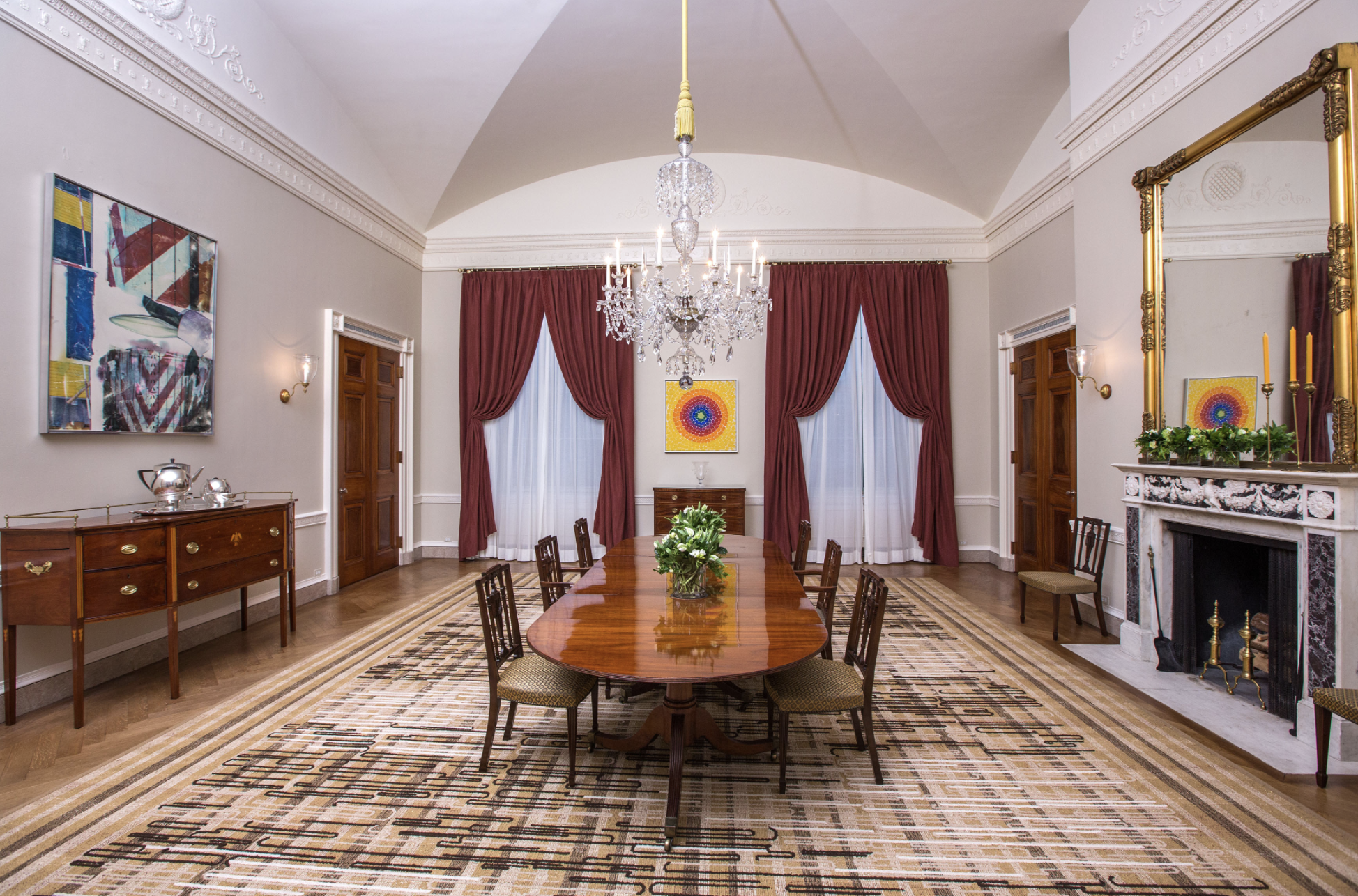 The White House Family Dining Room. Design based on an Anni Albers weaving, worked directly with the Josef and Anni Albers Foundation and designer Michael S. Smith to translate woven product into tufted carpet paying homage to the materials used by artist